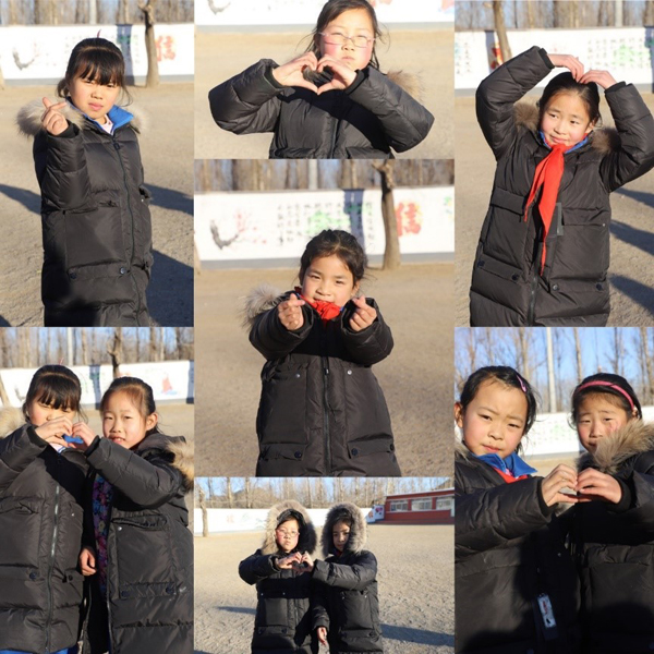 (孩子們為未能到場參加活動的叔叔阿姨們“比心”表達感恩之心)