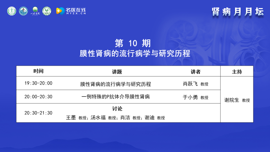 眾所周知,腎臟病患病率很高,特別是膜性腎病,在很多單位的腎活檢比例中占據(jù)首位。膜性腎病的無創(chuàng)診斷和治療手段日新月異,而且膜性腎病的異質(zhì)性很大,很多膜性腎病的病理表現(xiàn)大同小異,但是致病原因卻不一致,診療手段應(yīng)對應(yīng)病因。基于此背景,“腎病月月壇”自2022年5月17日開始舉辦,在每個月的第三周的周二晚上,每月一期,每期一個主題,已經(jīng)舉辦了9期,包括”激素和免疫抑制劑在膜性腎病的合理應(yīng)用”、“利妥昔單抗在膜性腎病的合理應(yīng)用”、“原發(fā)性和繼發(fā)性膜性腎病的鑒別”、“中醫(yī)對膜性腎病的認(rèn)識”、“膜性腎病的抗原分類及發(fā)病機(jī)制”、“膜性腎病的臨床表現(xiàn)、無創(chuàng)診斷和病理診斷”、“膜性腎病的自發(fā)緩解和非免疫抑制治療”、“非典型膜性腎病的病理表現(xiàn)及鑒別診斷思路”、“膜性腎病與腫瘤”。本期是“腎病月月壇”的第10期,主題是“膜性腎病的流行病學(xué)與研究歷程”,通過對膜性腎病不同的專題進(jìn)行深入探討,希望大家對膜性腎病有更深的認(rèn)識。膜性腎病近幾年在診斷方面有跨時代進(jìn)步,特別是非創(chuàng)傷性的檢測磷脂酶A2受體,對疾病的診斷、預(yù)后判斷、治療選擇上都非常有幫助。還有膜性腎病各種新的治療手段,包括單克隆抗體在膜性腎病中的應(yīng)用進(jìn)展也日新月異。針對這些問題,本期特舉辦膜性腎病的流行病學(xué)與研究歷程的專題學(xué)術(shù)活動,邀請的講者和點評、討論嘉賓都是業(yè)內(nèi)非常著名的臨床專家、研究生導(dǎo)師、腎內(nèi)科主任,具有豐富的臨床、教學(xué)和科研經(jīng)驗,相信他們的分享一定會對大家的臨床診療有所幫助。