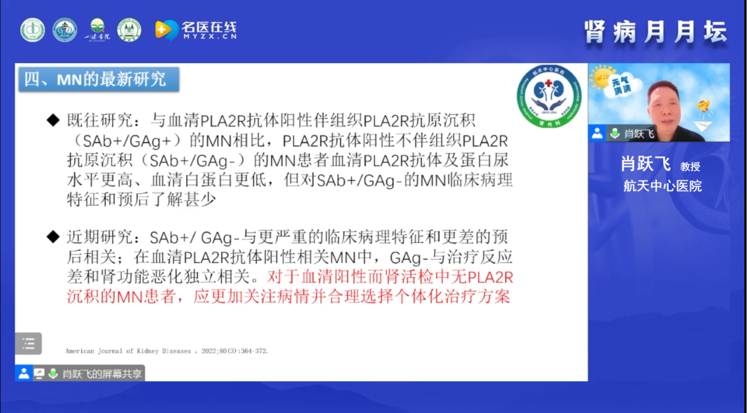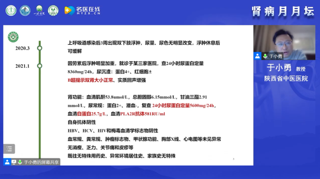 于小勇教授在線分享了一例特殊的抗PLA2R抗體介導(dǎo)的膜性腎病。于教授詳細(xì)介紹了患者的診治經(jīng)過及隨訪情況,該患者是一名24歲的年輕男性,甘肅人,間斷性雙下肢浮腫2年余,因勞累后加重而入院,復(fù)查24小時尿蛋白定量 5.6g/24h、血清白蛋白 25.7g/L、血抗PLA2R抗體 581RU/mL,同時于教授也進(jìn)行了其他可能繼發(fā)性因素的排查,并以甘肅本地腫瘤發(fā)病率高低為依據(jù)進(jìn)行了腫瘤的排查,上述結(jié)果均未見異常。初步診斷為腎病綜合征、PLA2R抗體介導(dǎo)的膜性腎病,在追加病理檢測后,修訂診斷為原發(fā)性腎病綜合征、PLA2R抗體介導(dǎo)的膜性腎病(II-III期)。隨后,以指南建議為依據(jù)進(jìn)行了規(guī)范治療,血清學(xué)標(biāo)志物變化出現(xiàn)非常罕見現(xiàn)象:Scr、ALB和24h尿蛋白都在轉(zhuǎn)好,而抗PLA2R抗體的水平在經(jīng)歷前期一次下降后,轉(zhuǎn)而開始攀升未再下降,最后一次檢測結(jié)果24h尿蛋白為0.15g/24h、抗PLA2R抗體為221.1RU/mL,隨訪時患者自我感覺良好。于教授拋出以下幾點思考:MN是否均應(yīng)該依據(jù)高抗體滴度啟動免疫治療?某些情況下是否動態(tài)監(jiān)測,讓子彈再飛一會?患者臨床緩解,免疫學(xué)尚未緩解的原因是什么?隨后,于教授帶著問題進(jìn)行了精彩的文獻(xiàn)復(fù)習(xí)與回顧,為問題真相的揭示給出了更多的探索方向。