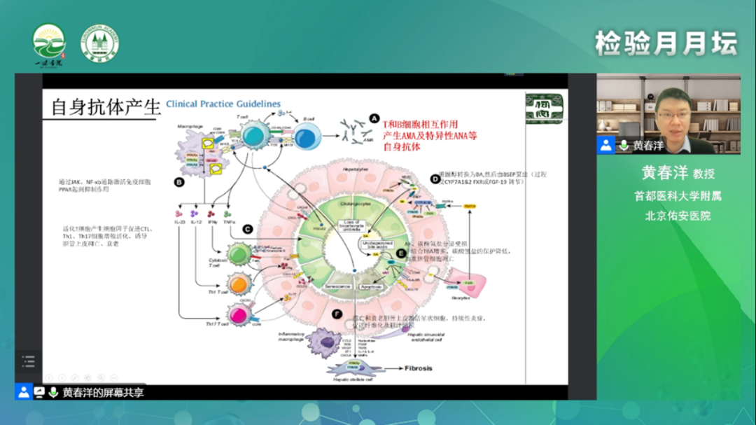 學(xué)術(shù)分享環(huán)節(jié)的最后,黃春洋教授指出自身抗體在自身免疫性肝病的診斷及預(yù)后判斷的作用。本次會議的講題就是從自身抗體的角度來看一下PBC有哪些疾病特點(diǎn)。主要分享從PBC自身抗體的產(chǎn)生、PBC自身抗體的分布以及不同自身抗體陽性PBC的特點(diǎn)三大部分展開。首先黃教授對PBC疾病的定義以及自身抗體產(chǎn)生的機(jī)制進(jìn)行了簡要的介紹,他指出PBC是一種由自身免疫反應(yīng)介導(dǎo)、慢性的、進(jìn)行性膽汁淤積性肝病。PBC的臨床特點(diǎn)包括膽汁淤積、相關(guān)自身抗體陽性及特征性的肝臟病理變化。黃教授對自身抗體做了大篇幅地講解。自身抗體的產(chǎn)生基因及環(huán)境等因素相關(guān),免疫耐受打破。隨后,黃教授又利用多篇研究數(shù)據(jù)介紹了自身抗體檢測體對PBC診斷及病情預(yù)后判斷的作用。他強(qiáng)調(diào),抗線粒體抗體(AMA),它是PBC的血清學(xué)診斷標(biāo)志,其M2亞型診斷PBC的靈敏度和特異度高達(dá)95%以上,但也可以出現(xiàn)在其他肝病患者,多表現(xiàn)為低滴度自身抗體。除此之外,黃教授又結(jié)合自身多年的臨床實(shí)踐經(jīng)驗,對抗著絲點(diǎn)抗體(ACA)、抗210抗體等ANA特異性檢測指標(biāo)在PBC中的預(yù)后及診療價值一一進(jìn)行了詳細(xì)地介紹。最后,黃春洋教授對上述自身抗體在PBC診療過程中的作用進(jìn)行了總結(jié)。