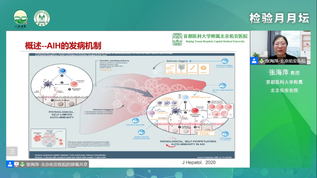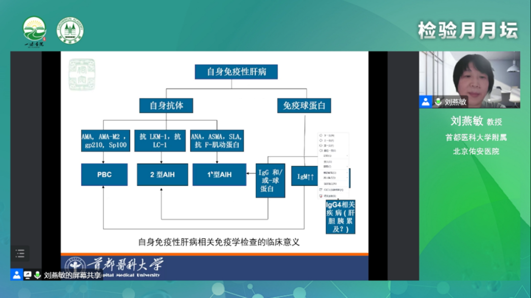 接著,劉燕敏教授為我們介紹了自身抗體的概念、簡介。自身抗體是診斷自身免疫性肝病重要指標(biāo),一些非特異性自身抗體也可以出現(xiàn)在其他肝病中。肝臟疾病合并自身抗體陽性有三種情況:自身免疫性肝病、其他原因肝病合并自身免疫性肝病以及非自身免疫性肝病伴免疫現(xiàn)象。劉教授就這三種情況各自展開介紹。先介紹了自身免疫性肝病的分類、相關(guān)免疫學(xué)檢查的臨床意義、自免肝相關(guān)抗體及其臨床意義、原發(fā)性膽汁性膽管炎相關(guān)抗體及其臨床意義,劉教授指出自身抗體是診斷自身免疫性肝病的主要特征之一,但不是所有的自身抗體陽性伴肝功異常都診斷自身免疫性肝病。接下來劉教授講述了其他原因肝病合并自身免疫性肝病,如病毒性肝炎合并自身免疫性肝病,介紹了病毒性肝炎的病毒性指標(biāo),指出慢性病毒性感染合并自身免疫性肝病常難以識別和確診,容易造成延誤診斷。對于病毒性肝炎合并AIH的患者,AIH的診斷往往落后于病毒性肝炎,AIH的最終診斷應(yīng)基于血清學(xué)特征、組織學(xué)發(fā)現(xiàn)、評分系統(tǒng)、治療反應(yīng)和結(jié)果。與單純PBC患者相比,合并HCV感染的PBC患者更容易并發(fā)肝癌,PBC合并HCV感染的患者比合并HBV感染的患者更容易發(fā)生肝硬化,且預(yù)后較差。劉教授還列舉了幾個臨床案例向我們展示了其他原因肝病合并自身免疫性肝病的臨床特點(diǎn)、臨床診治過程。最后劉教授介紹了非自身免疫性肝病伴免疫現(xiàn)象。對非自身免疫性肝病伴免疫現(xiàn)象,需鑒別HCV感染、藥物性肝損傷、非酒精性脂肪性肝病、Wilson病。
