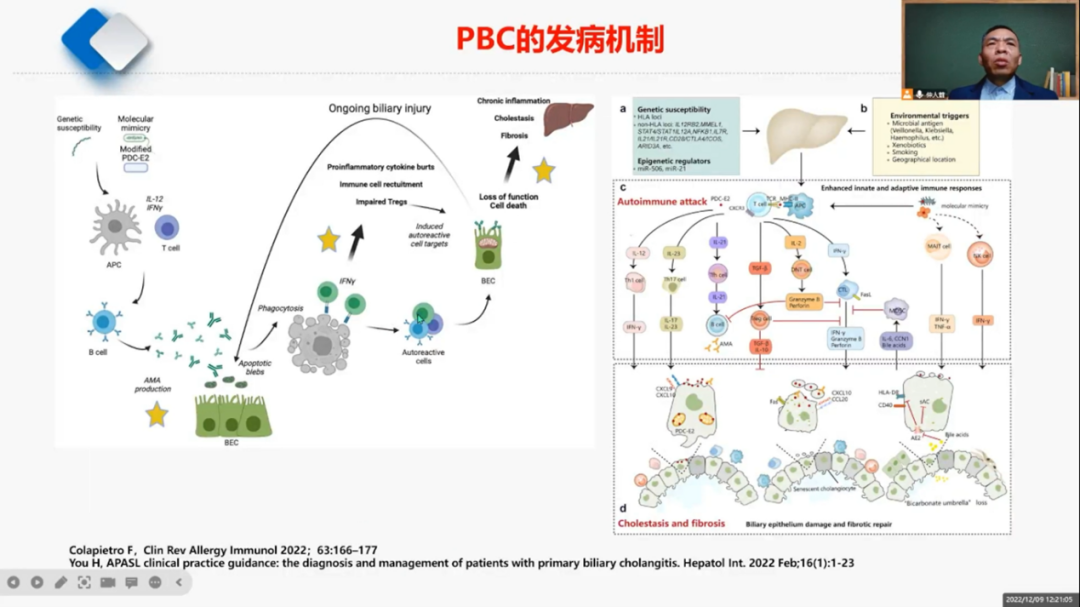 仲教授接著介紹了PBC相關(guān)自身抗體,介紹了第一類抗體如AMA和AMA M2的核型、相關(guān)抗原及對應(yīng)相關(guān)疾病。第二類抗體如核膜型的抗gp210抗體、核點(diǎn)型的抗sp100抗體、著絲點(diǎn)型的抗CENP抗體都與PBC相關(guān)。通過蛋白組分的技術(shù)檢測到抗KLHL12和HK1抗體在AMA陰性的患者中檢測率高達(dá)50%。仲教授還介紹PBC病因?qū)W主要有基因組學(xué)、表觀遺傳、環(huán)境因素等相關(guān)內(nèi)容。最后分享了3例PBC病例報道,包括PBC診斷不及時的老人、罕見兒童PBC、新冠mRNA疫苗誘發(fā)急性自身免疫樣肝炎伴非典型AMA和ANA。