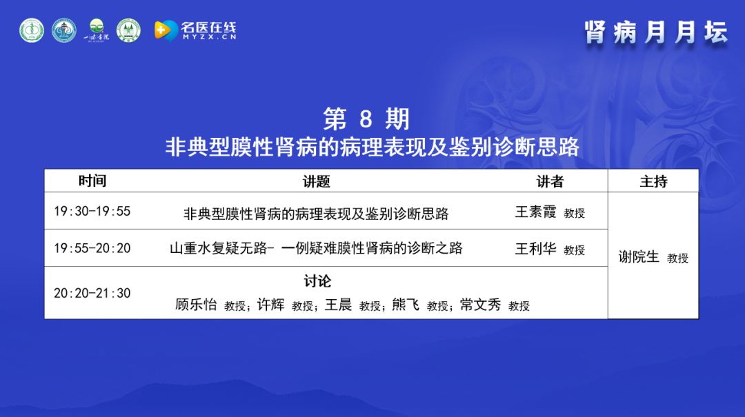 眾所周知,腎臟病患病率很高,特別是膜性腎病,在很多單位的腎活檢比率中占據(jù)第一;膜性腎病的無(wú)創(chuàng)診斷和治療手段日新月異;而且膜性腎病的異質(zhì)性很大,很多膜性腎病的病理表現(xiàn)幾乎一致,但是致病原因卻不一致,診療手段應(yīng)對(duì)應(yīng)病因。基于此背景,“腎病月月壇”自今年5月17日以來(lái)開(kāi)始舉辦,在每個(gè)月的第三周的周二晚上,每月一期,每期一個(gè)主題,已經(jīng)舉辦了七期,包括“激素和免疫抑制劑在膜性腎病的合理應(yīng)用”、“利妥昔單抗在膜性腎病的合理應(yīng)用”、“原發(fā)性和繼發(fā)性膜性腎病的鑒別”及“中醫(yī)對(duì)膜性腎病的認(rèn)識(shí)”、“膜性腎病的抗原分類及發(fā)病機(jī)制”、“膜性腎病的臨床表現(xiàn)、無(wú)創(chuàng)診斷和病理診斷”以及“膜性腎病的自發(fā)緩解和非免疫抑制治療”。今天是第8期,本期論壇的主題是“非典型膜性腎病的病理表現(xiàn)及鑒別診斷思路”。邀請(qǐng)的講者和點(diǎn)評(píng)、討論嘉賓都是業(yè)內(nèi)非常著名的臨床專家、研究生導(dǎo)師、腎內(nèi)科主任,具有豐富的臨床、教學(xué)和科研經(jīng)驗(yàn),相信他們的分享一定會(huì)對(duì)大家的臨床診療有所幫助。