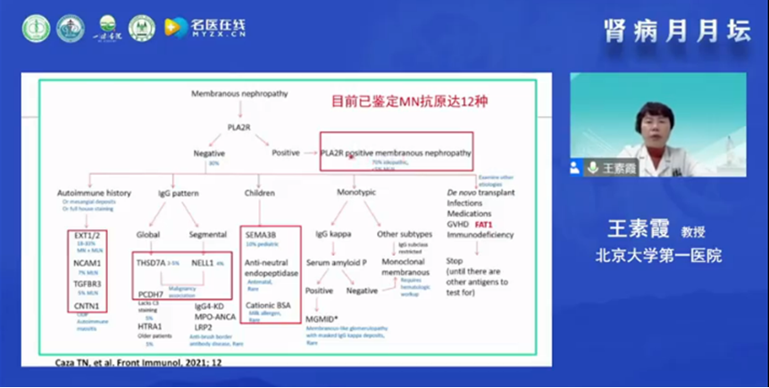 王素霞教授在線分享了非典型膜性腎病診斷和鑒別診斷的思路。首先介紹了膜性腎病的基本病理特征,以及近十年來(lái)膜性腎病致病性抗原的研究有了飛速的進(jìn)展,尤其在2009年Beck團(tuán)隊(duì)發(fā)現(xiàn)了原發(fā)性MN的抗原PLA2R及血清抗體IgG4。使得對(duì)MN的認(rèn)識(shí)有了飛躍的進(jìn)展。王教授指出對(duì)于非典型膜性腎病的診斷,首先應(yīng)當(dāng)根據(jù)其病理表現(xiàn)進(jìn)行初步的判斷。繼發(fā)性MN常表現(xiàn)為不典型MN,光鏡檢查、免疫熒光、IgG亞型-輕鏈、抗原檢測(cè)和電鏡檢查等有助于典型與非典型MN的鑒別診斷。多種病因可導(dǎo)致繼發(fā)性膜性腎病,青年人應(yīng)排除外感染、自身免疫病、藥物、毒物(汞)等相關(guān)MN;老年人注意排除外腫瘤相關(guān)MN。腫瘤相關(guān)MN的抗原種類包括NELL-1,IgG亞型以IgG1為主,第二位與腫瘤相關(guān)的MN抗原為THSD7A,也有相關(guān)文獻(xiàn)表明極少數(shù)腫瘤相關(guān)MN也可表達(dá)PLA2R。王教授還指出不同致病性抗原的檢測(cè)有助于繼發(fā)性MN的病因?qū)W診斷,MN為一類病理形態(tài)相似的損傷模式,推薦基于抗原與繼發(fā)性疾病相結(jié)合的MN新分類,將為臨床治療與發(fā)病機(jī)制探討提供重要依據(jù)。