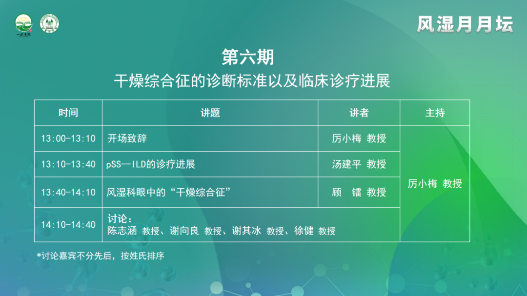 2022年11月25日,由一味書院主辦的《風濕月月壇(第6期)——干燥綜合征的診斷標準以及臨床診療進展》于線上成功舉行。本次論壇由中國科學技術大學附屬第一醫(yī)院厲小梅教授擔任大會主席,同濟大學附屬同濟醫(yī)院湯建平教授、江蘇省人民醫(yī)院顧鐳教授作為講課嘉賓,福建省立醫(yī)院陳志涵教授、馬鞍山市人民醫(yī)院謝向良教授、四川大學華西醫(yī)院謝其冰教授、昆明醫(yī)科大學第一附屬醫(yī)院徐健教授作為本次大會的討論嘉賓。