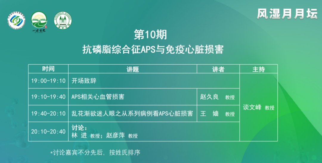 談文峰教授首先表示非常高興與各位同道、各位專(zhuān)家線(xiàn)上相見(jiàn),參與到本次風(fēng)濕月月壇中,本期的主題是“抗磷脂綜合征APS與免疫心臟損害”。很榮幸,今天邀請(qǐng)到了兩位專(zhuān)家作為授課嘉賓及兩位討論嘉賓。APS和心肌/心臟損害,大家關(guān)注得并不多,希望通過(guò)本次會(huì)議,可以拓展大家的思維,收獲新的認(rèn)識(shí)。