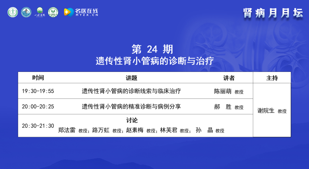 謝教授簡(jiǎn)單介紹了“腎病月月壇”的歷史,“腎病月月壇”是在2022年5月開始舉辦的線上學(xué)術(shù)交流活動(dòng),迄今為止正好兩年時(shí)間,24個(gè)月共舉辦了24期,每月一期,每一期都是在每月第3周的周二晚上19:30-21:30開展,形式是講座與討論相結(jié)合。“腎病月月壇”最開始議題聚焦在膜性腎病,后來(lái)逐漸延展至多器官損害、新冠相關(guān)的多系統(tǒng)損害及風(fēng)濕性疾病的腎臟損害等,今年以遺傳性腎病為主,今天的主題是遺傳性腎小管病的診斷與治療,邀請(qǐng)了在該領(lǐng)域臨床及研究方面有很深造詣的專家進(jìn)行交流。