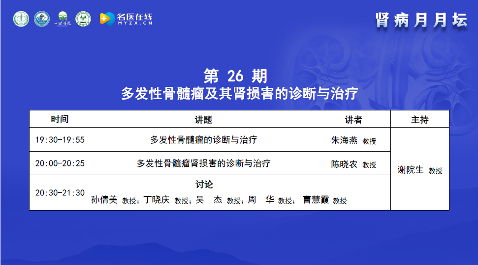 今天的主題是多發性骨髓瘤及其腎損害的診斷與治療,很榮幸邀請到了在該領域有很深造詣的專家,包括血液病專家、腎臟病專家、中西醫專家,都是一線非常有經驗的科主任,一起進行學術講座、點評與討論。